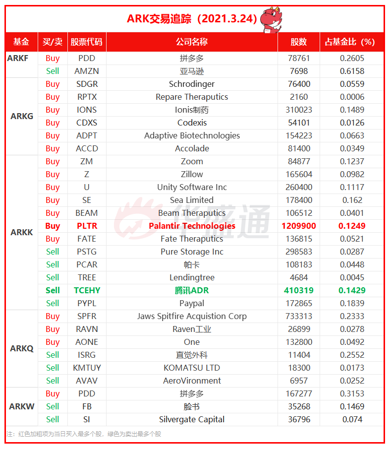 ARK3月24日共交易29笔,买入18笔,卖出11笔。与近日的交易量比起来,我们可以看到昨日ARK的交易明显增多,昨日美股市场科技股普跌,ARK把放在购物车里的股票趁着打折的机会狠狠加了一把仓,女股神昨晚一定梦里都在偷笑。昨日交易亮点如下: