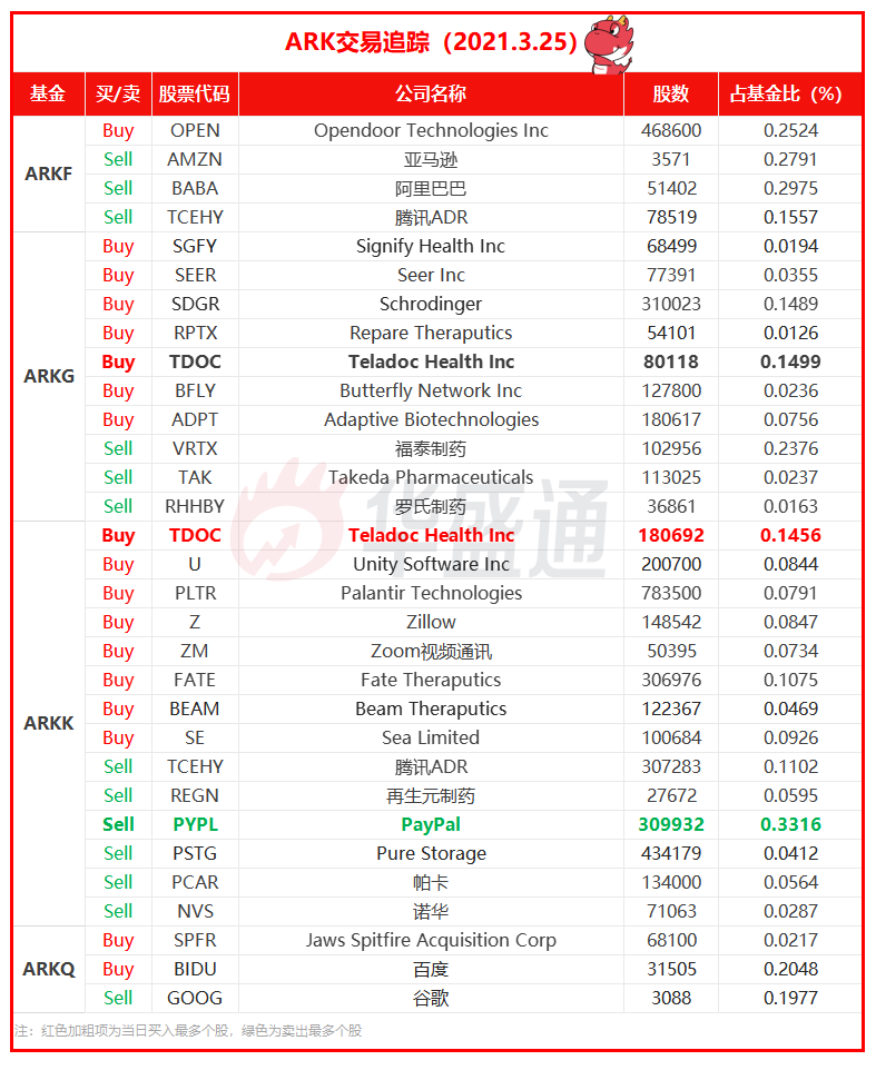 ARK 3月25日共进行31笔交易,买入18笔,其中10笔为成长型医疗科技股,2笔为房地产股;卖出13笔,其中7笔为互联网巨头公司,包含阿里巴巴、腾讯、亚马逊、PayPal等,5笔为医药巨头公司,包含罗氏制药、诺华、福泰制药、再生元制药、Takeda制药。