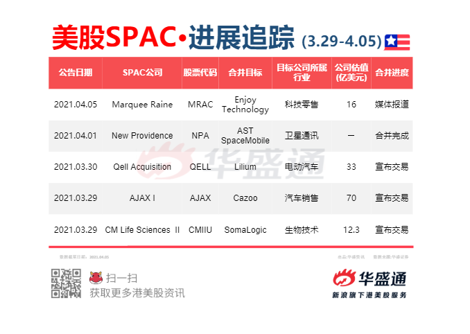 目前,SPAC合并市场共有5宗交易正在进行中。其中,4月1日合并完成的的AST SpaceMobile交易,据悉合并公司预计将在4月6日登陆纳斯达克交易。截至发稿,周一(4月5日)New Providence收盘上涨10.89%,股价报12.63美元。