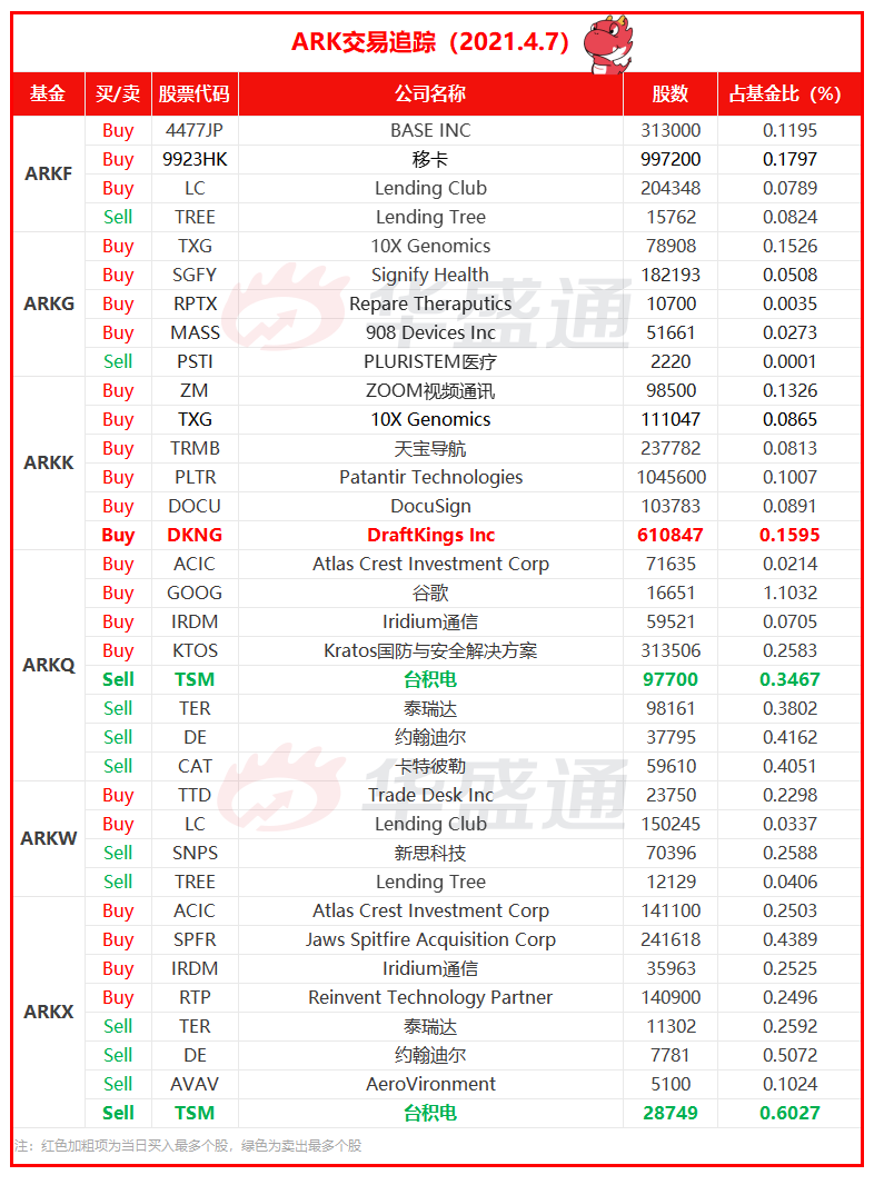 4月7日ARK共交易35笔,买入23笔,卖出12笔。昨日ARK的新基金首次发生操作,共交易8笔。