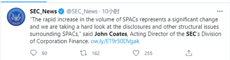 上周,SEC官员John Coates也在法律会议上表示,SPAC存在“一些重大但尚未发现的”问题。