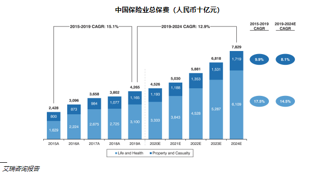 据艾瑞咨询报告显示,2019年中国医疗保健总支出7万亿元人民币(其中将近85%用于住院、购买药物和医疗器械),预计到2024年将达到11.4万亿,复合年增长率高达10.2%。但形成鲜明对比的是,中国的保险渗透率仅为4.3%,远低于发达国家10%左右的渗透率。因此,在巨大的医疗保障缺口和保险意识不断提高的推动下,艾瑞咨询预计2024年中国保险市场总保费将达到7.8万亿人民币,其中人寿健康类保险将超过6万亿元。