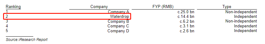 水滴作为不依靠所属平台在线流量支持的独立第三方保险经纪人,在市场处于领先地位。而其他领先的代理商如阿里巴巴旗下蚂蚁集团、腾讯旗下的微保,其实都非常依赖母公司的巨大流量。