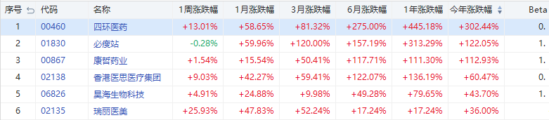拿港股市场来说,近一个月与医美相关的6只个股通通保持上涨,而在2021年初至今不到4个月的时间就出了四环医药、必瘦站、康哲药业三只股价累计翻倍的牛股。