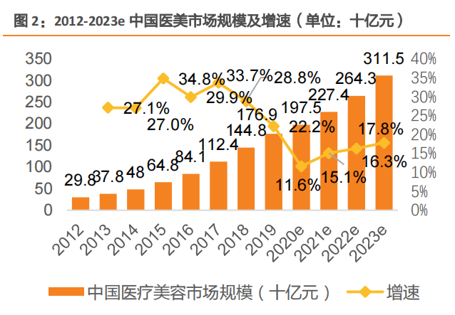 从数据上来看,过去2014-2019年中国医美行业的市场规模一直保持20%以上的高增速,整体增速远高于世界平均水平,由于疫情影响预计2020年中国医美市场增速将降至11.6%,但未来有望逐步恢复。