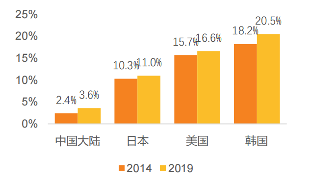 对标医美行业相对成熟的美国、日本、韩国,2019年三国渗透率分别高达16.6%、11%和20.5%,差距依然较大。