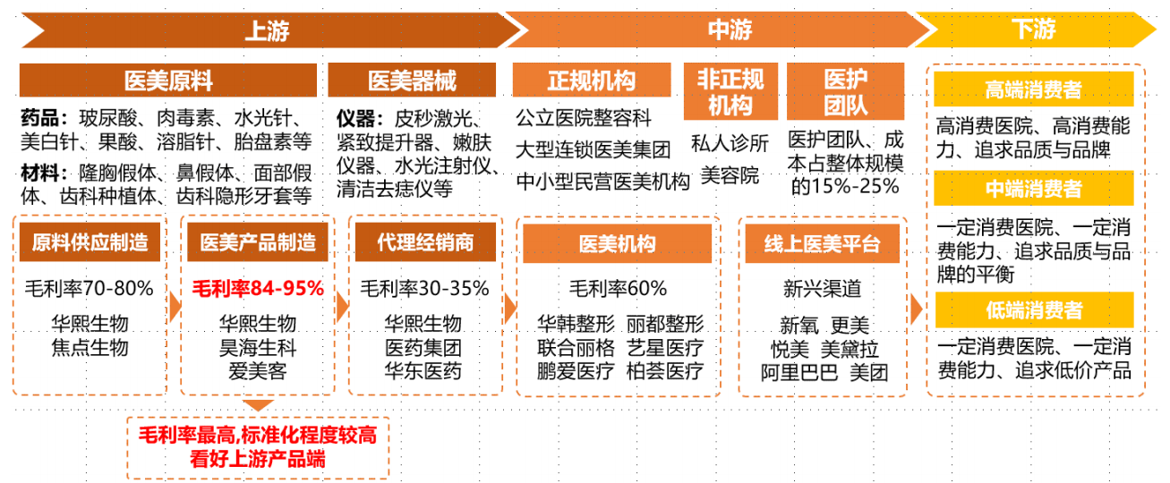 要想选择医美投资标的,就得先搞清楚医美产业链中哪个环节利润最高,目前国内医美行业的产业链主要分为上中下游三个环节。
