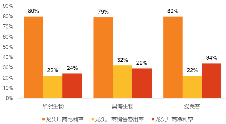 上游厂商因行业监管相对规范,且目前获得国家药品监督管理局批准的产品较少,产业相对集中度高,龙头企业利润率较高,龙头厂商毛利率在75-85%之间,净利率约维持在 25-37%之间。