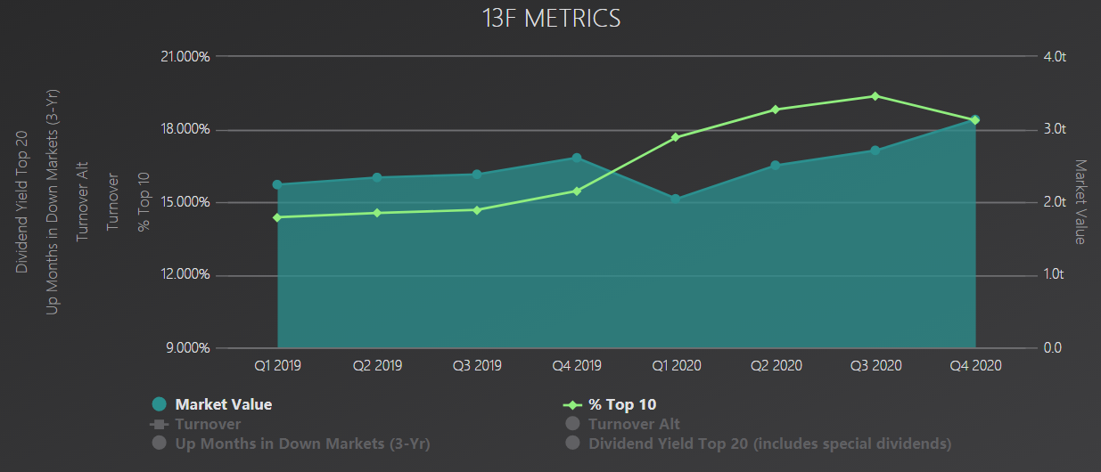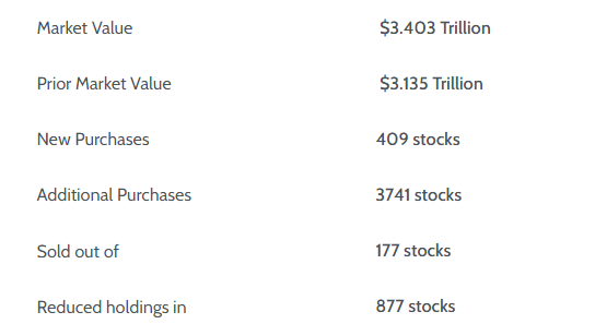 随着基金美股Q1持仓的法定披露期限将至,一系列全球投资者耳熟能详的知名投资机构逐渐披露最新多头仓位情况,其中全球最大资管贝莱德截至2021年3月31日总持仓市值达3.403万亿美元,上一季度总市值为3.135万亿美元,环比增长8.5%。