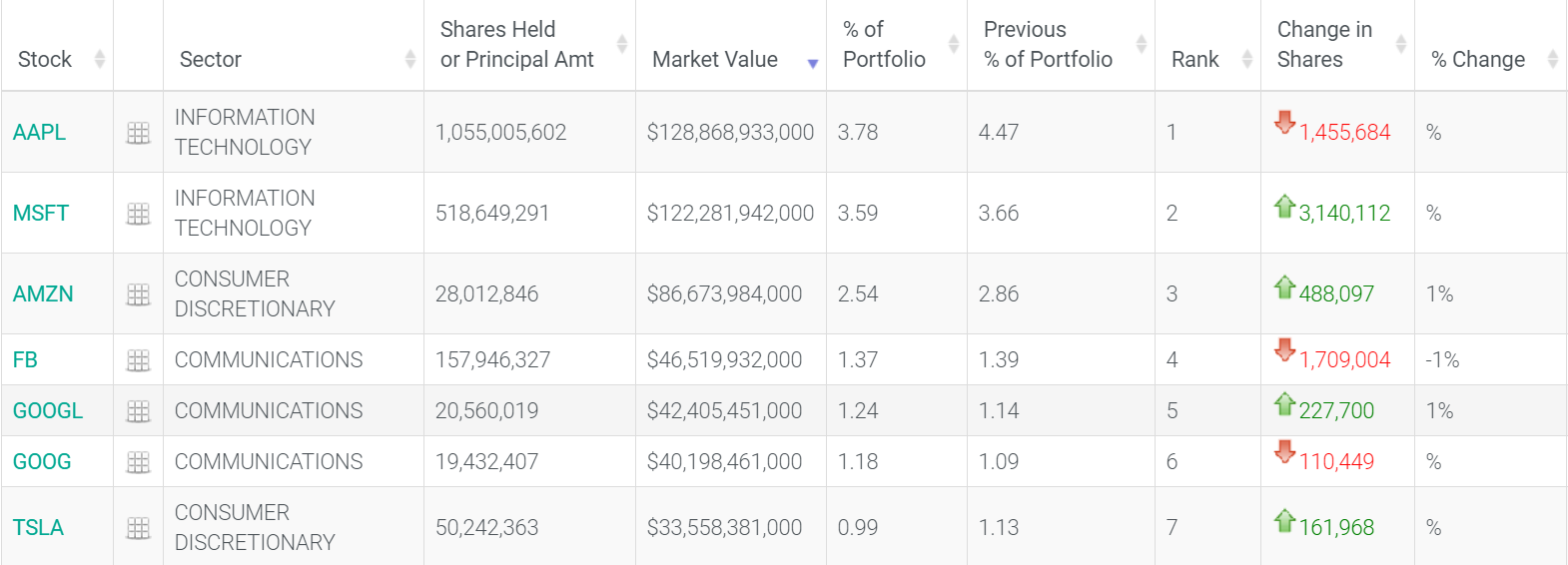 第四和第五分别为Facebook(FB)和谷歌母公司Alphabet(GOOGL),持仓市值分别约465.20亿美元和424.06亿美元。