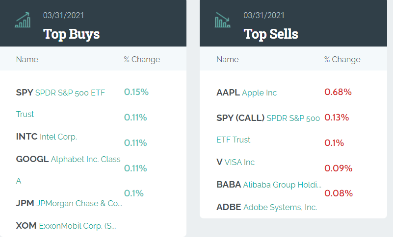 前五大卖出标的分别是:苹果(AAPL)、标普500指数ETF看涨期权(SPY,CALL)、VISA(V)、阿里巴巴(BABA)和Adoble(ADBE)。
