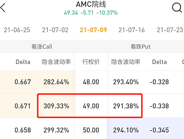 很明显,AMC院线7月9日的看涨和看跌期权都有很极端的隐含波动率,数值为300%附近的水平。这就告诉你到期前,期权定价中蕴含了巨幅波动,无所谓上涨还是下跌。