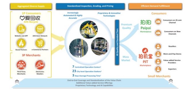 其中,爱回收是二手3C产品C2B回收平台,拍机堂为二手3C产品B2B交易平台,拍拍是二手优品B2C零售平台,AHS Device主要负责海外业务。