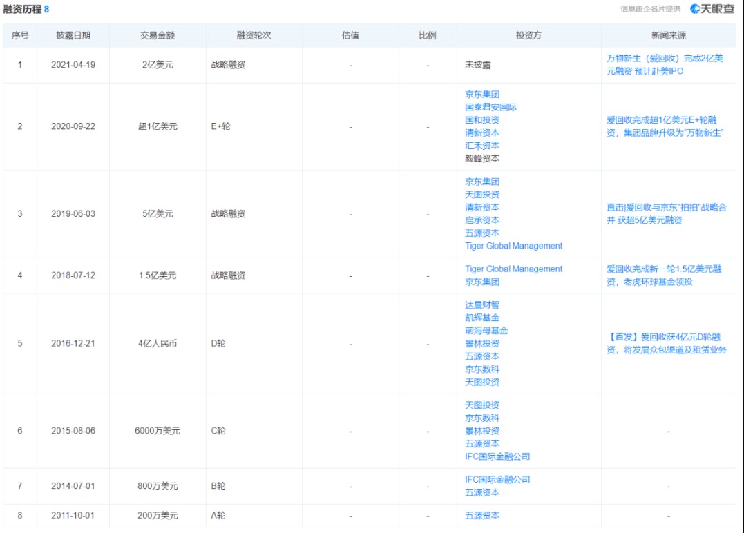 据公开资料统计,自2011年至今,爱回收共获得了来自五源资本、IFC、京东集团和老虎环球基金、天图资本、启承资本、国泰君安国际等知名投资机构的多轮融资,总额超10亿美元,无论是从次数还是从金额上都领先于其他二手电商平台。
