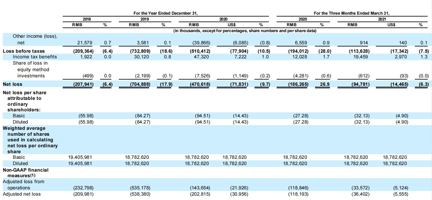 爱回收在现阶段尚未实现盈利,2020年非通用会计准则调整后经营亏损1.04亿元(剔除4000万元一次性费用后),2021年第一季度非通用会计准则调整后经营亏损3357万元,相比去年同期1.19亿元的亏损有所好转,但仍在亏损,深陷"营收却不盈利”的困局之中。