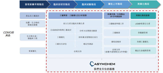 CDMO公司主要参与制药公司药品生产过程,另外亦会根据制药公司提供的药品化学结构提供生产工艺开发及优化服务,以及其他各种技术的增值服务,增加委托商药品上市后的价格竞争力。