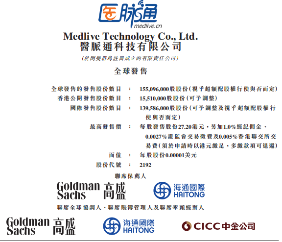 医脉通发售价为每股24.1-27.2港元,每手500股,本次IPO高盛和海通国际为其联席保荐人。
