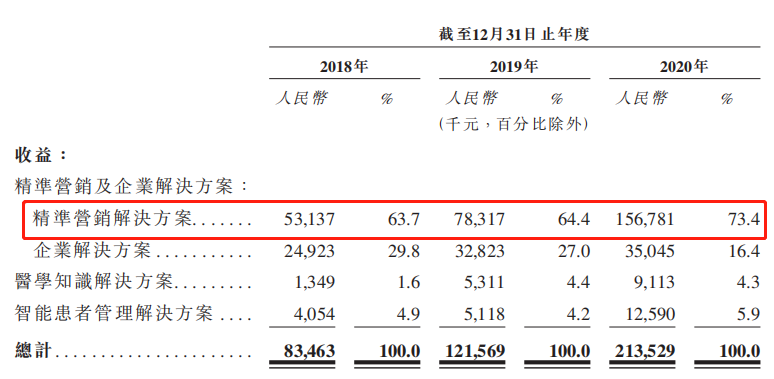 其中精准营销及企业解决方案在2020年占比营收达89.8%,为主力来源。而从趋势上看,精准营销解决方案占营收比重不断增长,到2020年占比达73.4,可谓核心营收来源。