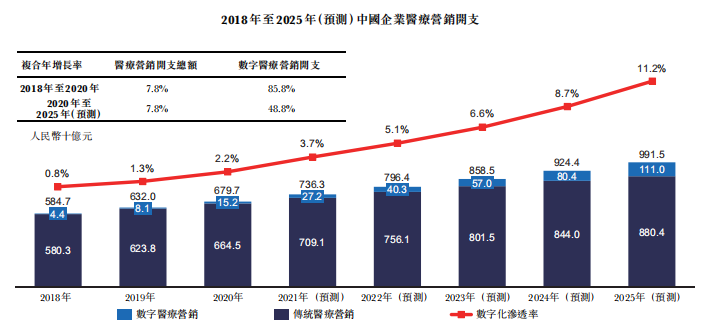中国数字医疗营销市场由2018年的人民币44亿元增至2020年的人民币152亿元,复合年增长率为85.8%,预计2025年将达到人民币1,110亿元,复合年增长率为48.8%。
