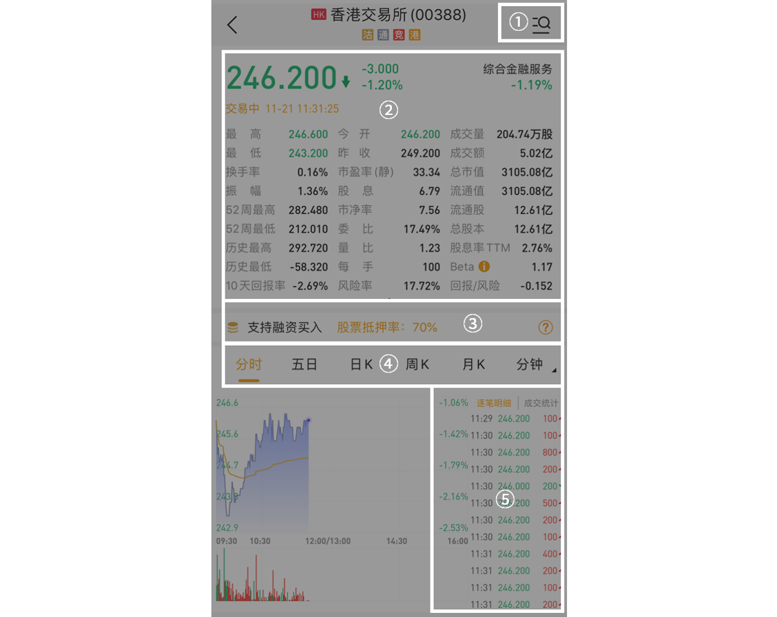 位置②:个股的基本面信息,包括最高/最低价、成交量等等,了解股票基本情况。