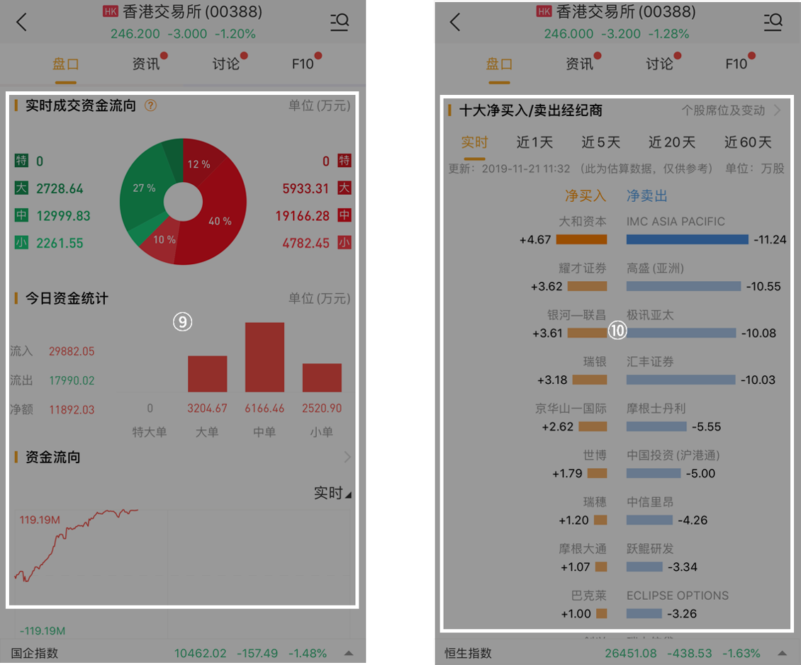 位置⑨:股票交易的实时资金变化,支持查询今日、过去几日等不同时间段的资金变化,帮助我们大体把握股票买入卖出情况。