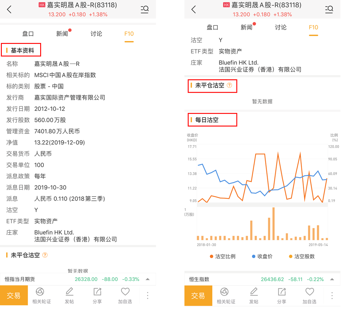 最后,除了股票外,ETF也能用“F10”功能查询基本的信息哦。香港市场的ETF,我们可以查询到包括基本资料、未平仓沽空和每日沽空数据。