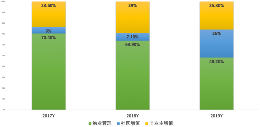 业务收入占比方面,世茂服务的业务收入逐步均衡化。2019年,物业管理、社区增值、非业主增值业务营收占比分别为48.2%、26%和25.8%,其中社区增值服务占比提升快速增长。