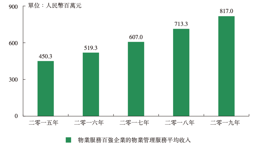 中国物业服务百强企业的物业管理服务收入通过内部增长及外部收购录得稳步增长。根据中指院的资料,中国物业服务百强企业物业管理服务的平均收入由2015年的4.5亿元增加至2019年8.17亿元,复合年增长率为16.1%。趋势来看,中国物管企业仍将继续保持一定的成长速度。