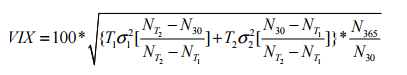 在计算出近期期权合约和次近期期权合约的波动率σ1和σ2后,通过下面加权公式计算出 VIX 指数值: