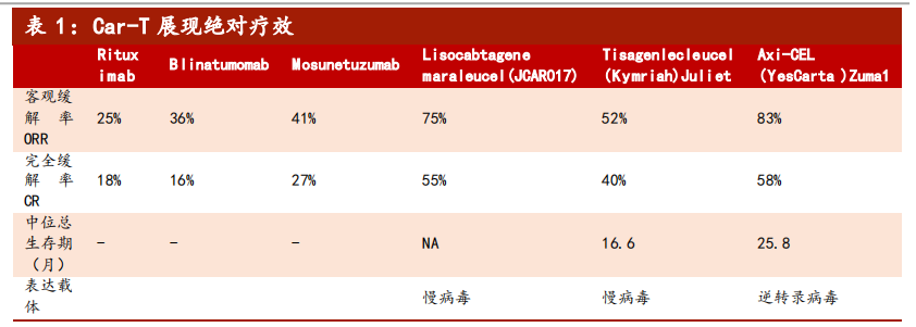 2017 年 10 月 18 日,Kite Pharma 的 CAR-T 产品 YesCarta(axicabtageneciloleucel,KTE-C19)经美国 FDA 批准上市,用于治疗成人复发或难治性大 B细胞淋巴瘤。YesCarta 是全球第二款获批上市的 CAR-T 产品,同时也是第一个用于治疗非霍奇金淋巴瘤的 CAR-T 产品。两款 Car-T 产品的获批,给本就已经火热的免疫治疗市场又注射了一剂强心剂。尽管获批的两款二代 Car-T 仍有许多不足之处,但其产品本身令人瞠目的疗效,令市场为之疯狂。