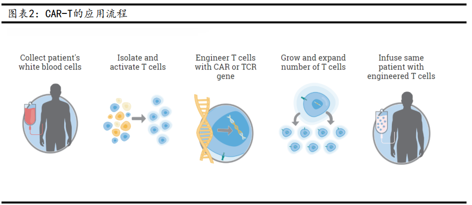 CAR-T应用的流程主要分为以下五个步骤:分离:从癌症病人身上分离T细胞。修饰:用基因工程技术给T细胞加入能识别肿瘤细胞并且同时激活T细胞的嵌合抗体制备CAR-T细胞。扩增:体外培养,大量扩增CAR-T细胞。回输:把扩增好的CAR-T细胞回输到病人体内。监控:严密监护病人,尤其是控制前几天身体的剧烈反应。