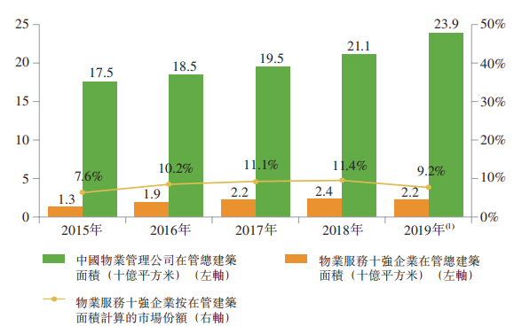 中国物业管理公司中,物业服务十强企业在管建筑面积的集中度由2015年的7.6%整体上升至2019年的9.2%。根受益于市场集中度的提升,物业服务十强企业平均净利润增长,按2015年至2019年的年复合增长率计算,高于物业服务百强企业的行业平均水平。