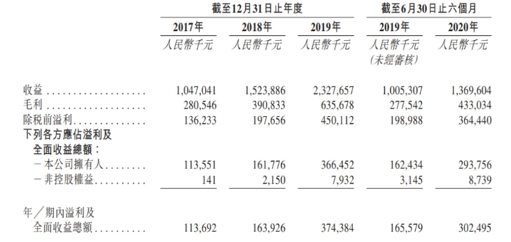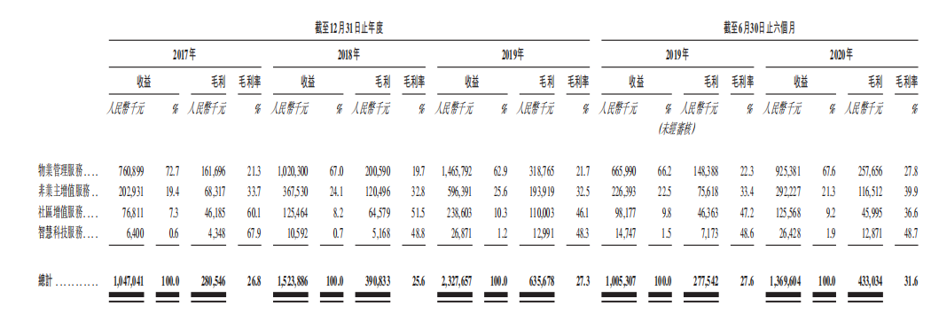 2017至2019年,金科智慧服务的业绩非常靓眼。营收由2017年的10.47亿元大幅增至2019年的23.28亿元,复合年增长率约为49.1%,同期净利润由1.14亿元大幅增至3.74亿元,复合年增长率约为81.5%。疫情之下金科智慧服务更是迎来业绩爆发,2020年上半年收益和纯利分别达到13.7亿元和3.025亿元,较2019年同期分别增加36.3%及82.7%。