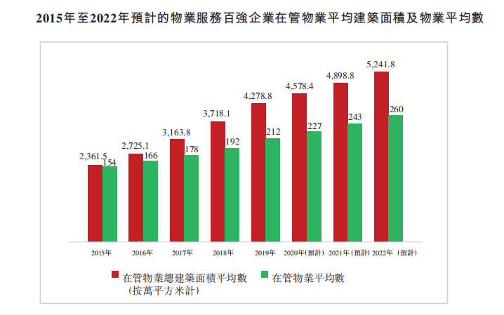 物业服务百强企业的在管物业总建筑面积平均数由2015年约23.6百万平方米增至至2019年约42.8百万平方米,复合年转化约16.0%。物业服务百强企业在管物业平均数由截至2015年12月31日的154个增至终止2019年12月31日的212个,复合年增长约为8.3%。