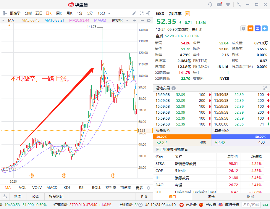 对此,跟谁学回应称,这些做空机构根本不懂自己的商业模式。跟谁学解释,主要原因有两个,其一是独特的名师经纪人模式;其二是超低的获客成本。和瑞幸不同的是,在国际机构的轮番攻击之下,跟谁学的股价却“越挫越勇”,从年初的21美元一度暴涨至141美元。