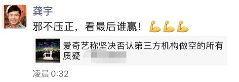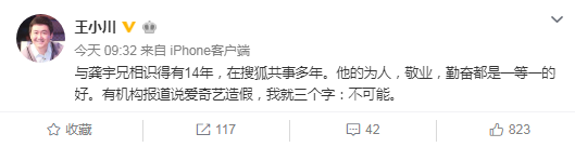 7日晚,爱奇艺CEO龚宇今日凌晨发朋友圈回应:邪不压正,看最后谁赢。8日上午,搜狗CEO王小川发微博评论此事,称与龚宇相识14年,并在搜狐共事多年。“他的为人,敬业,勤奋都是一等一的好。有机构报道说爱奇艺造假,我就三个字:不可能。”