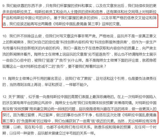品玩还称,“我们能依靠的东西不多,只有我们所掌握的资料和事实,以及在文章发出后,我们陆续收到的更多来自特斯拉员工、特斯拉前员工和业内人士提供的资料和信息,还有媒体和社交网络上对特斯拉产品和特斯拉中国公司的评价。基于我们掌握的更多的资料,以及非常严格的信息交叉验证和筛选,我们应该还能再写出两篇像《特斯拉中国乱象揭蛊 第三季》这样的文章。”