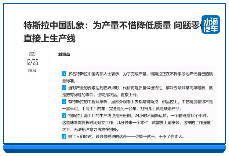文章援引多名特斯拉中国内部人士的说法,“为了完成产量,特斯拉正在不择手段地降低自己的质量标准”、“特斯拉上海工厂的生产线也是三班倒,24小时不间断运转。一个轮班是12个小时”、“有特斯拉的工程师感叹,虽然外观看上去都是特斯拉,但品控上,工艺精度差得不是一星半点,上海工厂的车,完全是另一台车,打根儿上就是缺陷产品”等。