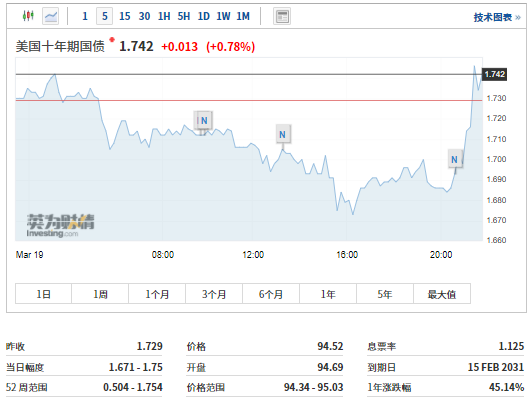 受此影响,美国10年期国债收益率短线跳升重返1.7%,现报1.742%。