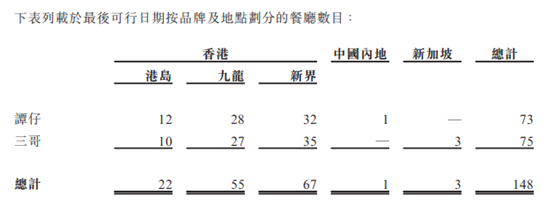 于最后可行日期,公司共经营148间餐厅,包括覆盖港九新界18区的72间谭仔餐厅及72间三哥餐 厅、中国内地深圳的1间谭仔餐厅及新加坡的3间三哥餐厅。