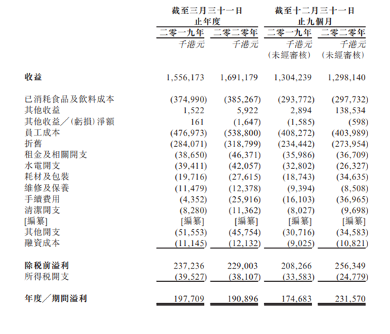 据招股书显示,2019年、2020年和2020年前九个月,谭仔国际的营业收入分别为15.56亿、16.91亿和 12.98亿港元,对应的净利润分别为1.98亿、1.91亿和 2.32亿港元。