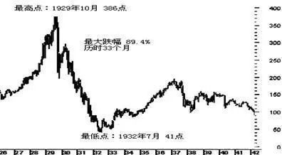 道琼斯指数于1921年从75点开始上升,1929年达到牛市最高峰381点,随后在“黑色星期二”之后的几周之内就跌到了200点以下,并于1932年达到了最低点――41点。从1929年9月到1932年大萧条的谷底,道琼斯工业指数大约缩水了90%。