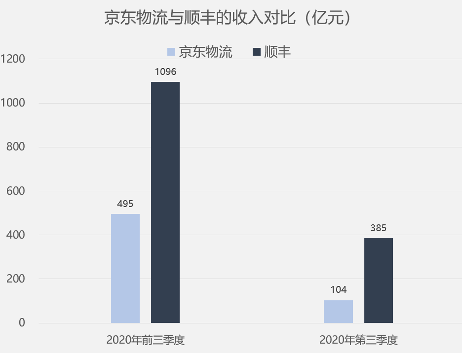 单季度数据对比来看,京东物流2020年第三季度的收入为104亿元,而顺丰营收为385亿元,同样是京东的数倍。