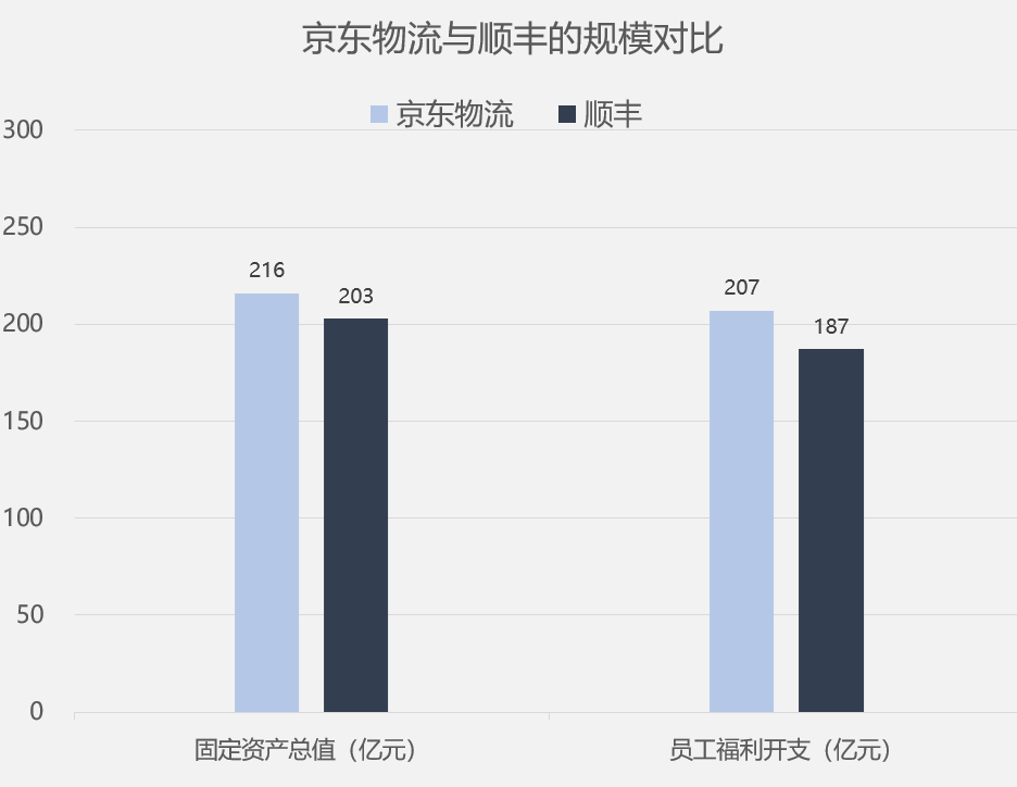 这也符合实际,京东物流走的是“仓库+配送”路线,更看重仓库,顺丰则提供点对点的物流服务,更看重运力。