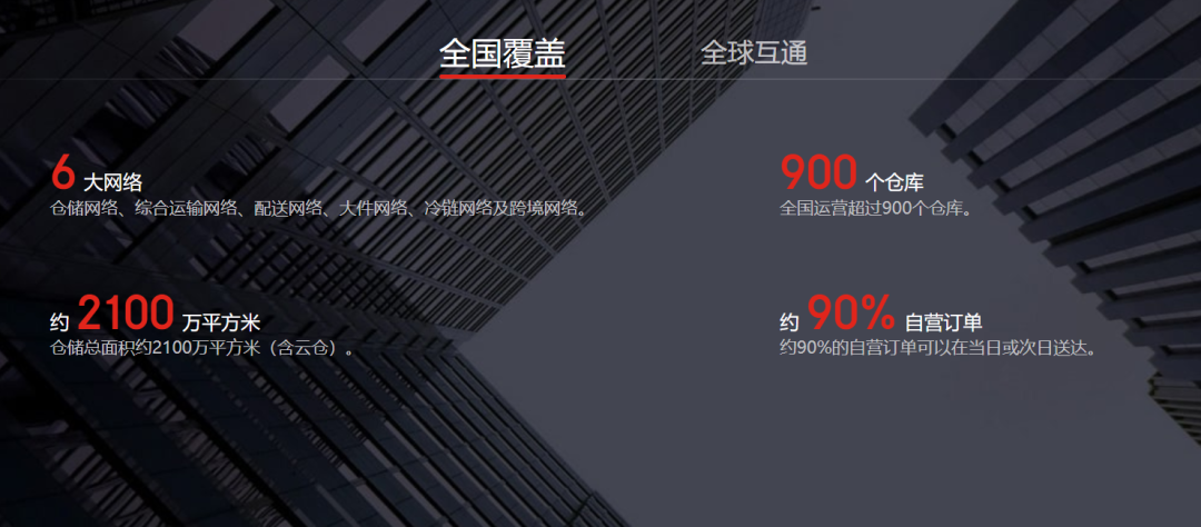 所以,京东不停地在全国各大城市建立仓储中心。目前,京东物流运营有超过900个自营仓库,总仓库面积约2100万平米。