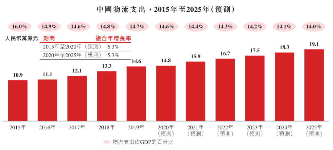 按照京东物流披露的数据,中国拥有世界最大的物流市场。2020年中国物流支出总额估计为14.8万亿元,且2020年至2025年的年复合增长率将达到5.3%。