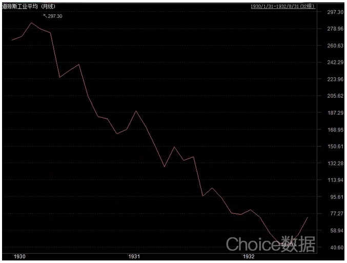 1929年正值美国大萧条开始,当年9-11短短两个月,道琼斯指数就经历了高达47%的跌幅,自380的高点跌至最低199点。随后由于疯狂加杠杆抄底等非理性行为,道指又回升到300点附近,涨幅高达50%。不过这种过度投机的繁荣还是引发了苦果:1930年4月至1932年7月,道琼斯指数彻底崩溃,跌幅高达86%,最低跌至40点附近,惨不忍睹。