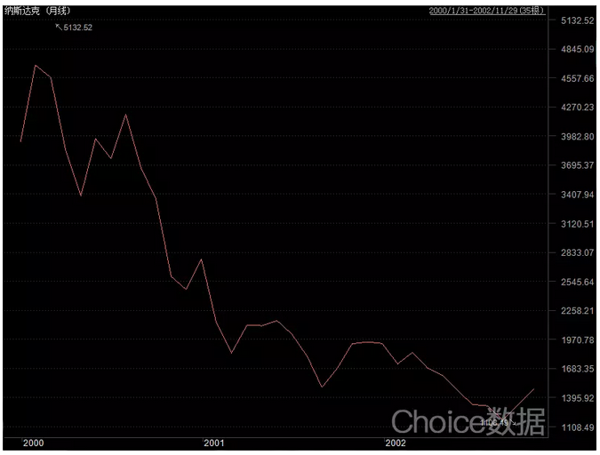 有意思的是,就在2000年第一季度后,纳斯达克指数开始了泡沫破灭的行情。到2002年,纳斯达克指数累计下跌近80%,标普500指数也被带崩40%之多。尽管作为新兴行业的互联网在成长阶段的高增长是诱人的,但过高的预期带来的估值泡沫更是需要警惕的。
