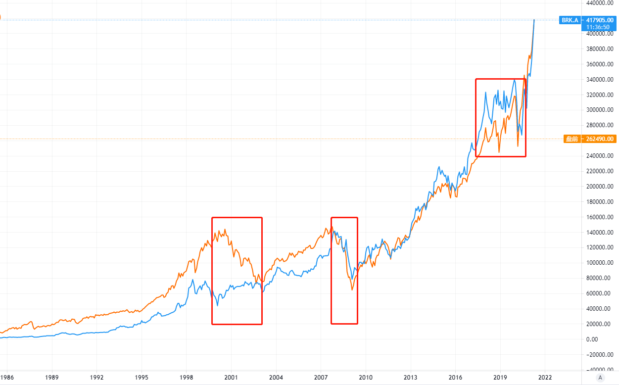 伯克希尔(蓝)熊市表现好于标普500(橙)来源:tradingview
