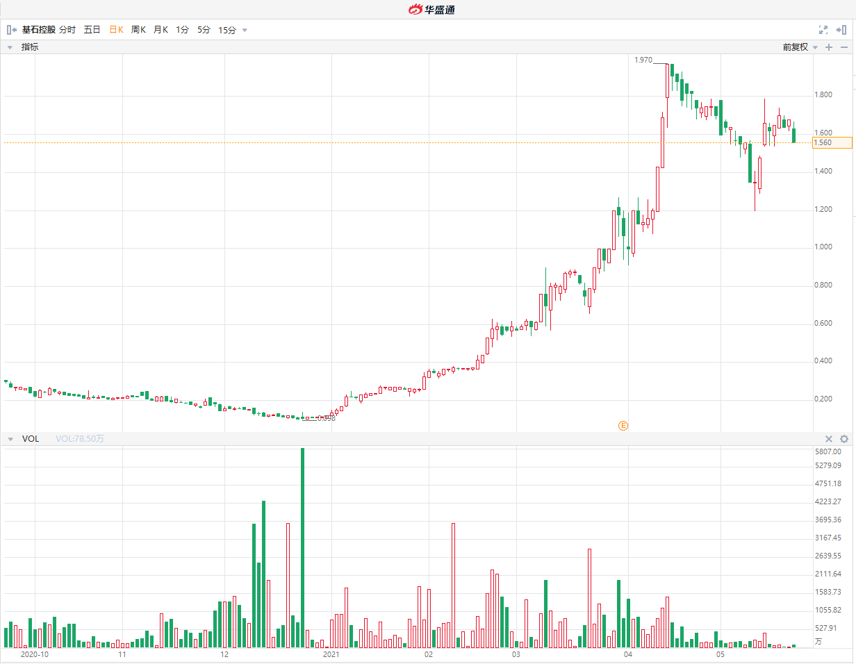 这只股票在今年的走势真是不得了:按最低0.1港元算,股价在4个多月时间内,最高冲到1.97港元,足足上涨了近20倍!目前股票市值在20亿港元左右,也并不算高。也就是说,股价低、市值小,基石控股都占了。